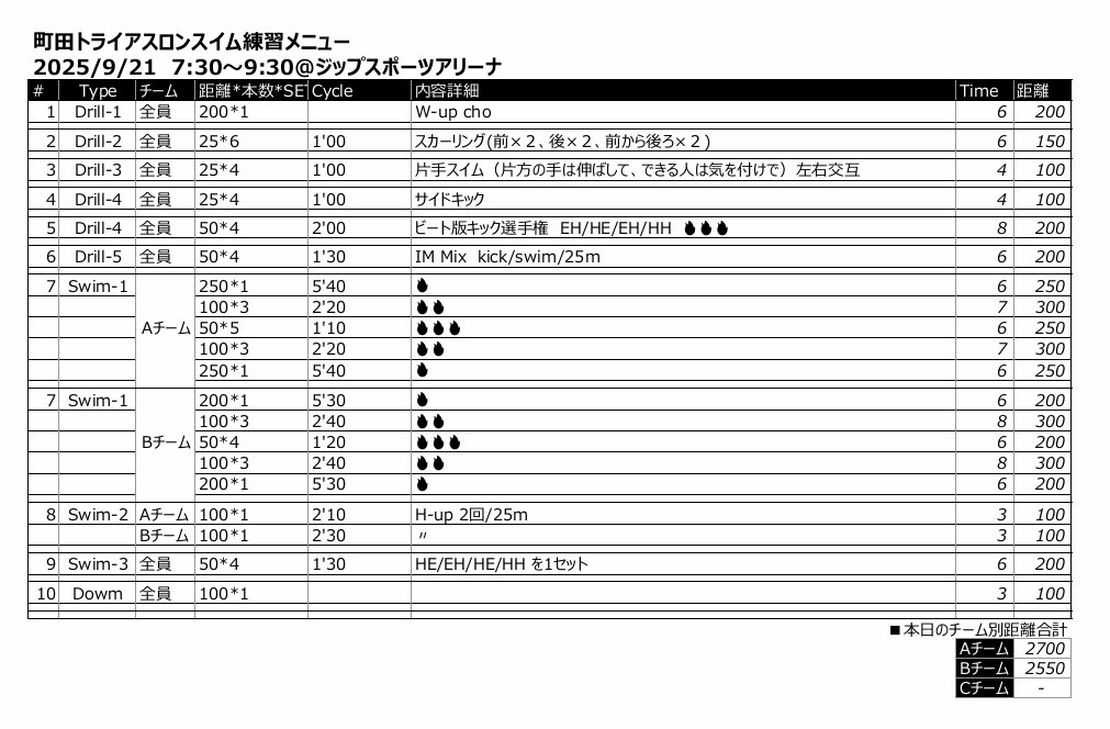 9時までは5コース利用して、適宜5チームに分けました。Aチームは2'00、Bチームは2'10、Cチームは2'20くらいのイメージ。今回もドリルでキックを多めにしてみました。